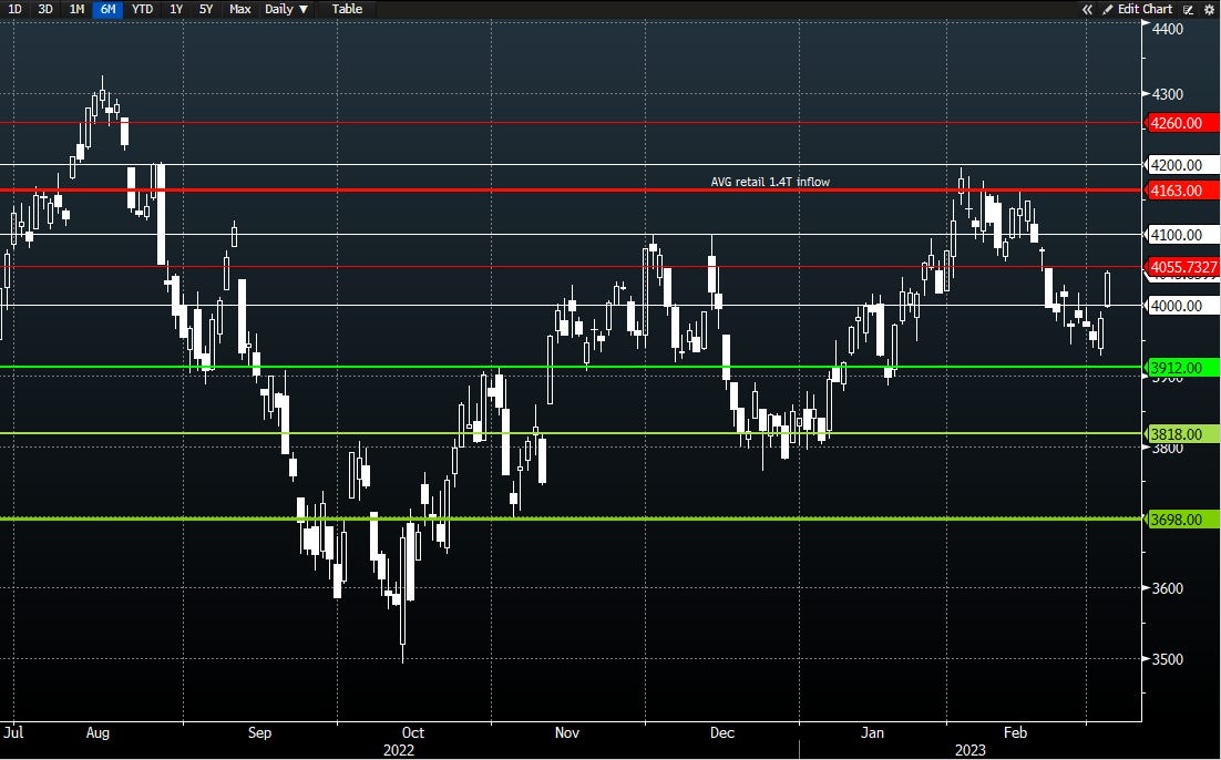 Options trades of the week… on Thursday, I gave an ES 3975/4000 bull put for Friday expiration at -20 which was cut at -3 and settled for 0. On Friday, I gave an ES 4000/4030 bull put at -21.25 closed at -1… settled for 0.